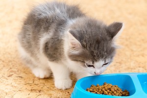 Nutrition plays a critical role in a kitten's first days in a new home. While it's important to choose high quality food, it is recommended to let your kitten eat the food she's used to at first. To switch from one food to another, proceed in stages and follow your veterinarian’s recommendations. Kittens and adult cats have different nutritional needs; typically, kittens are hungrier and need to eat several times in a day.