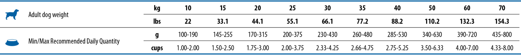 Ham protein %25,00; ham yağ %16,00; ham lifler %2,70; nem %9,00; ham kül %7,90; Kalsiyum %1,00; Fosfor %0,80; Omega-6 %3,00; Omega-3 %0,70; DHA %0,35; EPA %0,15; Glukozamin 1000mg/kg; Kondroitin sülfat 700mg/kg.